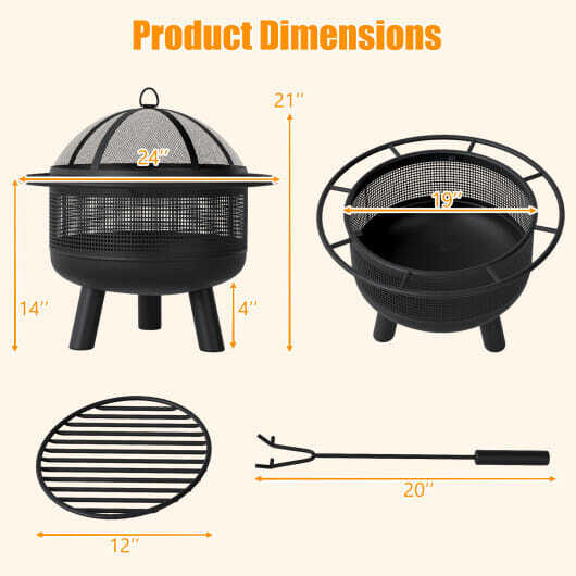24 Inch Wood Burning Fire Pit with Log Grate and Mesh Screen for Outside