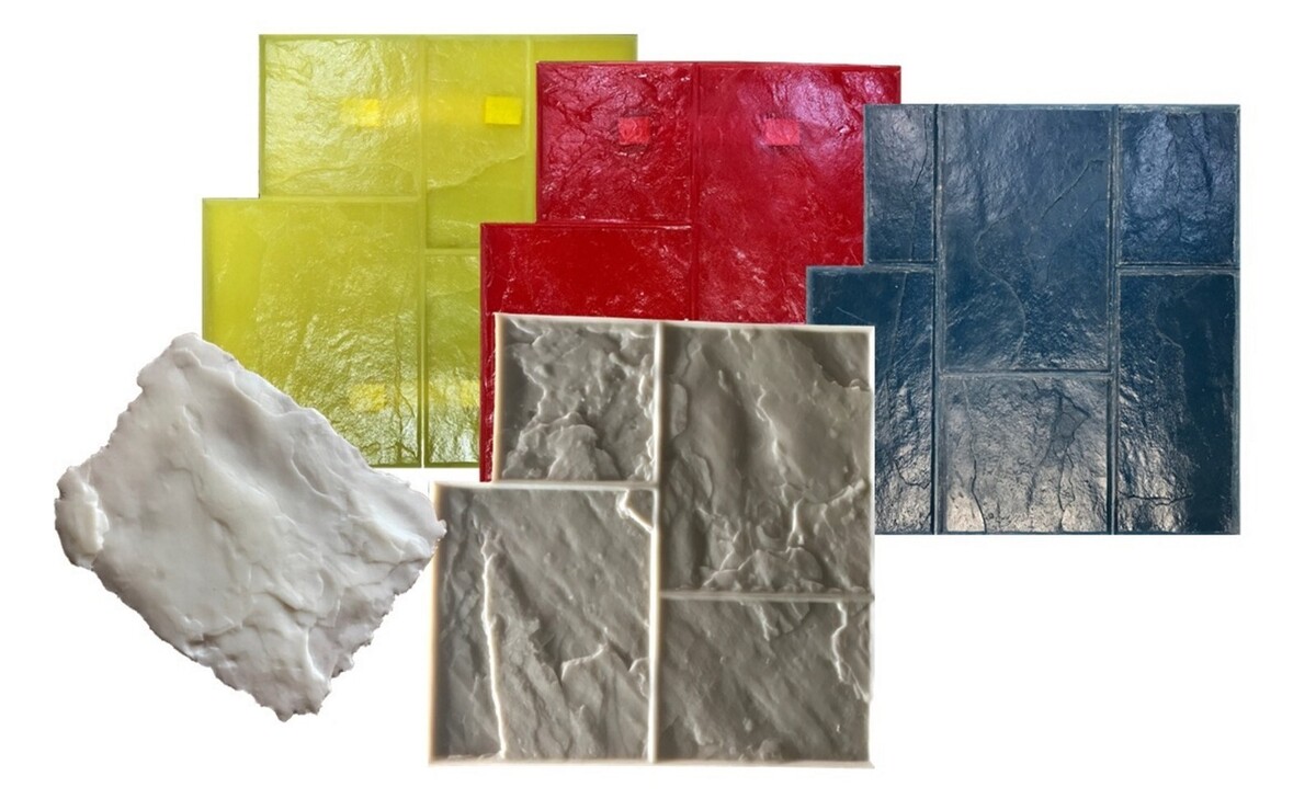 These are the strong and solid built mat types and are firm enough to stand on. The RIGID Stamps Mat have handles for easy lifting and moving. The RIGID Stamps Mat are used to stamp majority of the stamping job. Rigid Stamp Mats usually red, blue and yellow color coded. Each stamp has unique pattern variation to lend an authentic look and achieve a more random appearance.