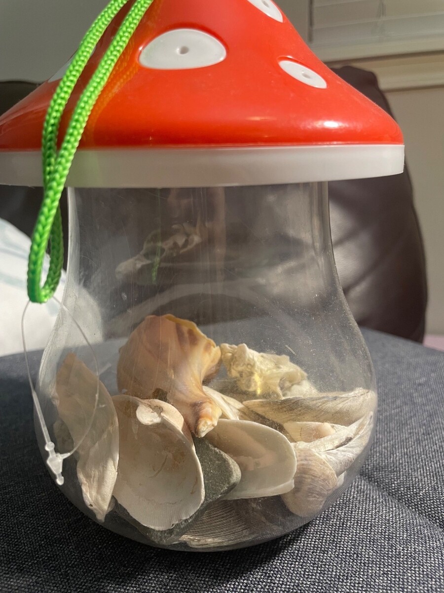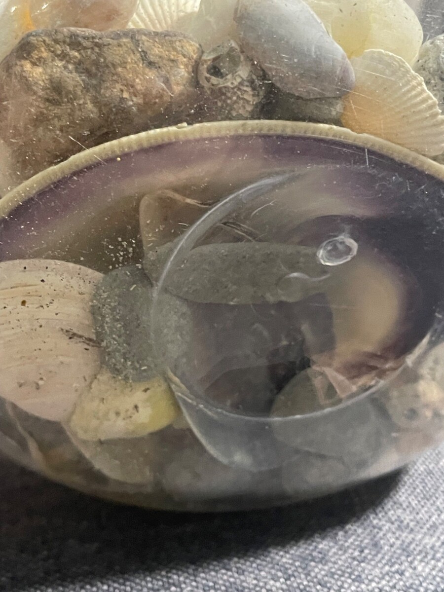 This one-of-a-kind display features real shells and stones collected from Goodspeed Island Beach in Mattapoisett, Massachusetts, a coastal area on the South Coast of New England. The contents are natural and unaltered, with visible texture, sand, and organic characteristics that reflect their authentic beach-found condition.