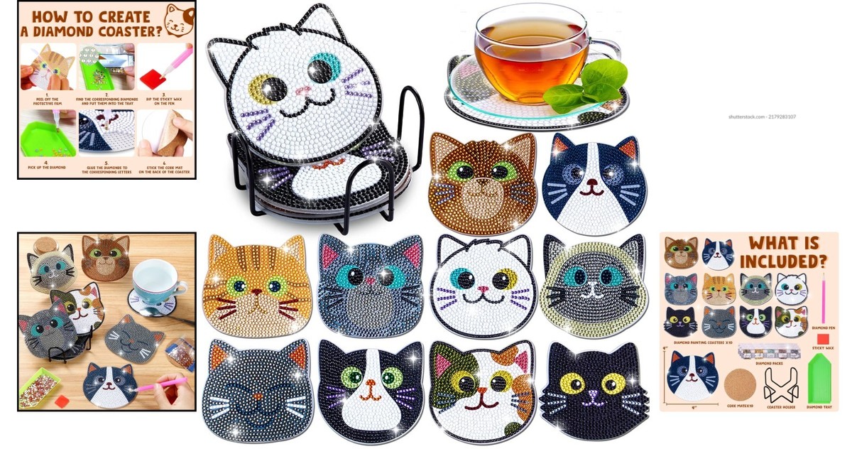 Creative 10PC Diamond Art Coasters for Kids & Adults - Adorable Cat Designs