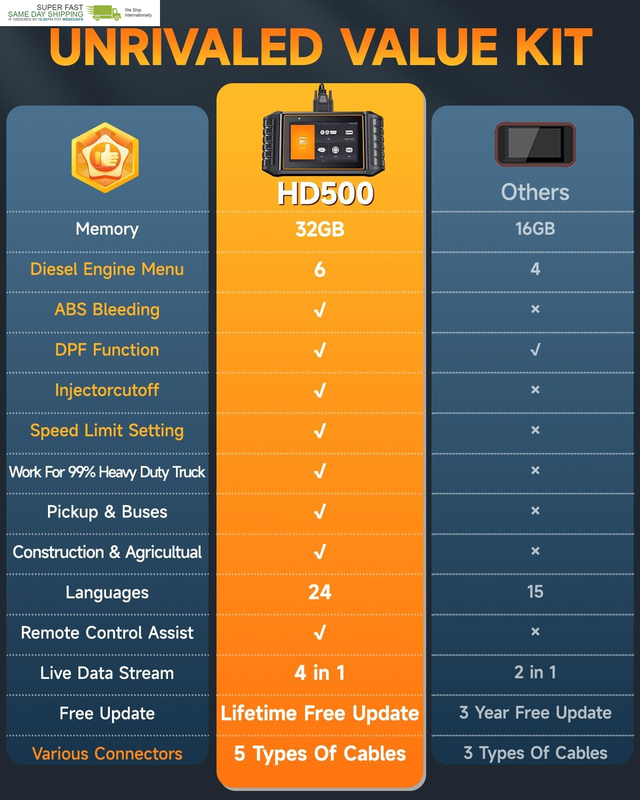?Speed Limit Reset ABS?Set speed limits for safety and reset engine/road speed parameters on supported vehicles. Plus, bleed the ABS module to restore a firm brake pedal. The HD500 diesel scanner diagnostic tool keeps your fleet safer, saves repair costs, and minimizes downtime. (Speed limit reset not available on all engines?check VIN before purchase.)