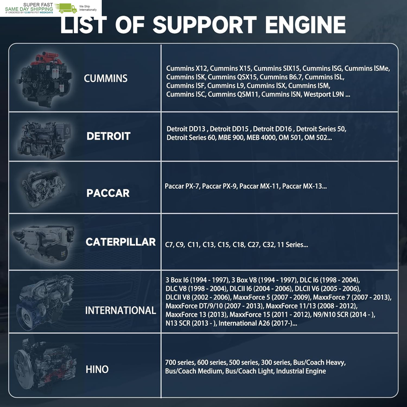 This truck diagnostic tool that encompasses many engines, works good to read and clear codes, finding truck breakdowns and confirming repairs, which is very convenient for our day-to-day diagnostics.