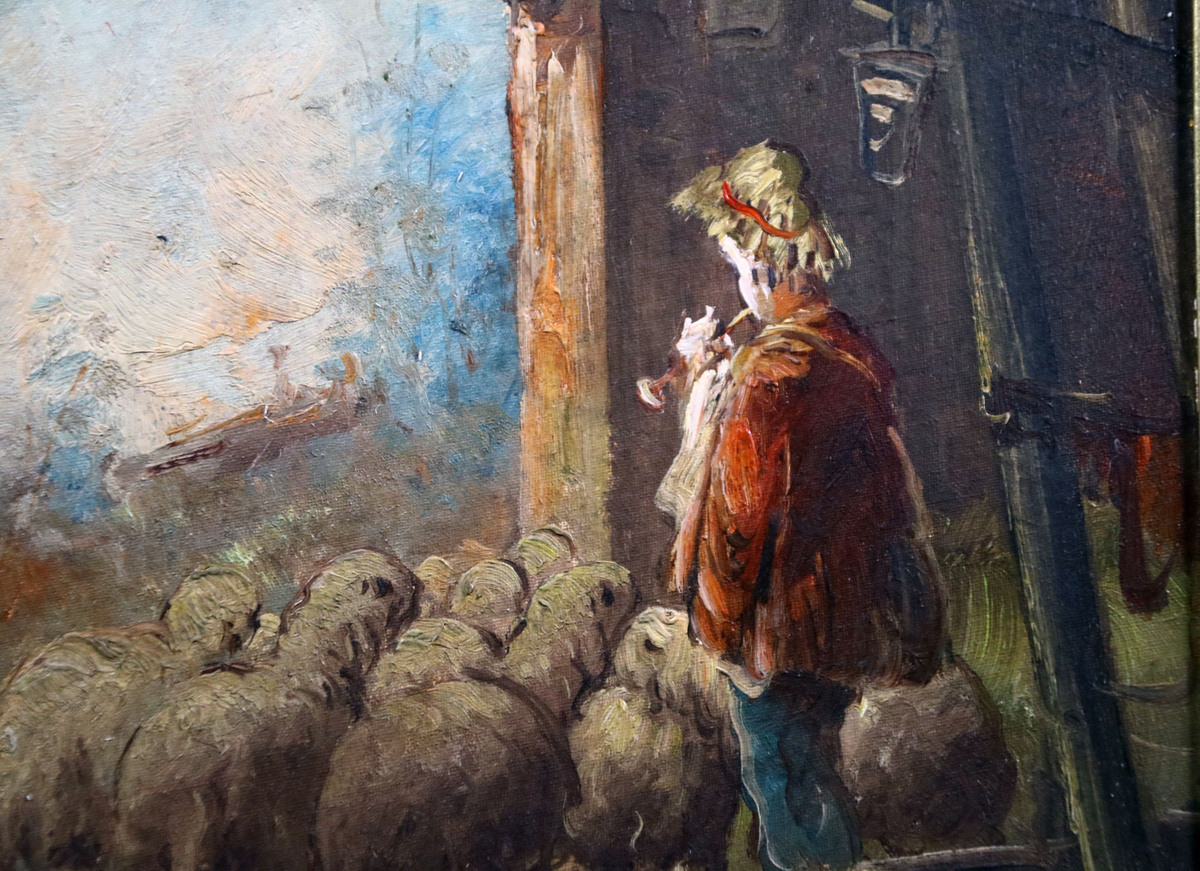 Vintage Oil Painting by Mario Fattori – Shepherd & Sheep – Rustic Pastoral Scene