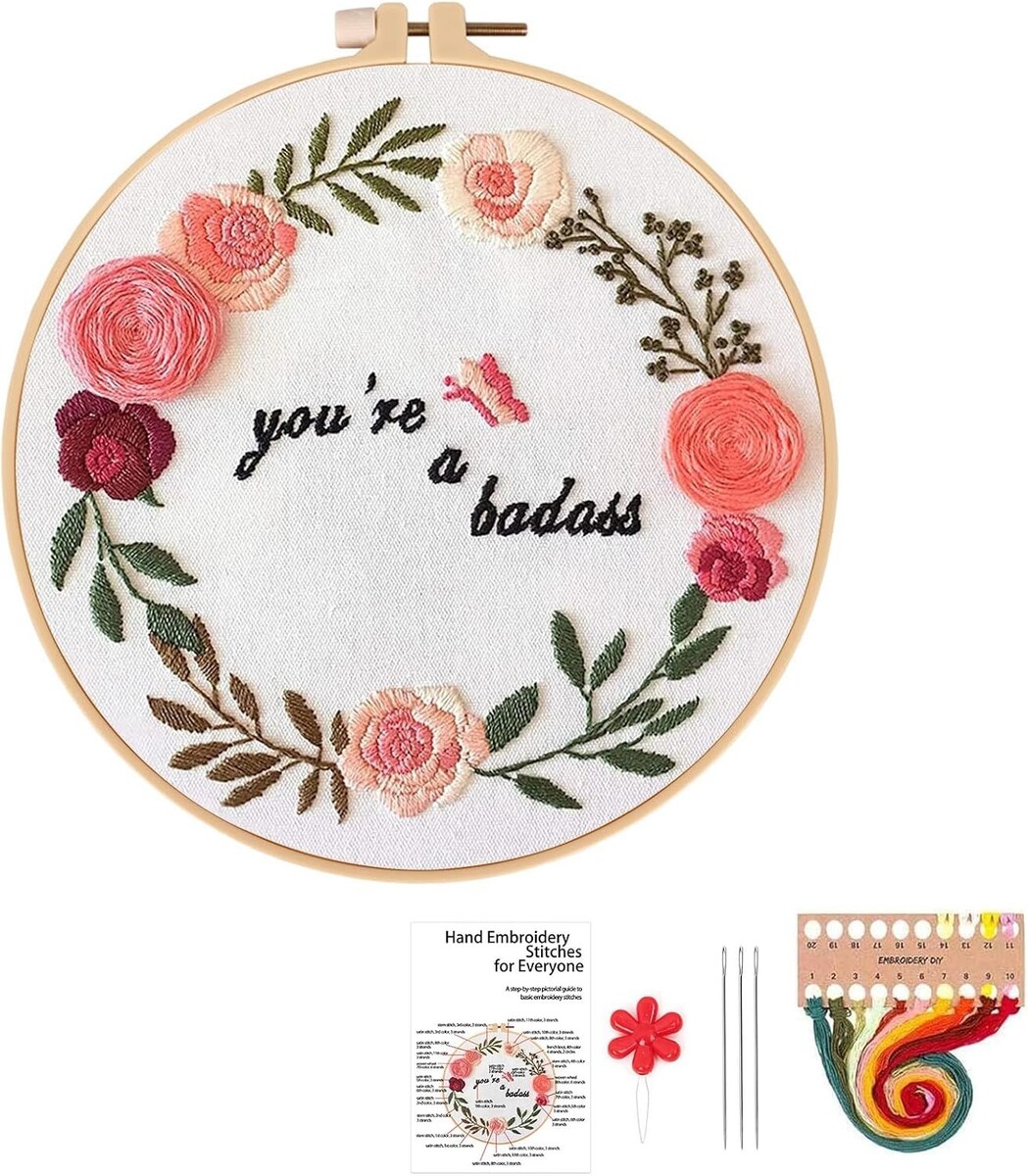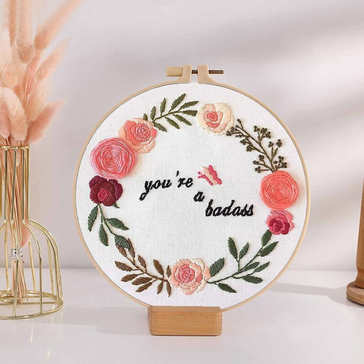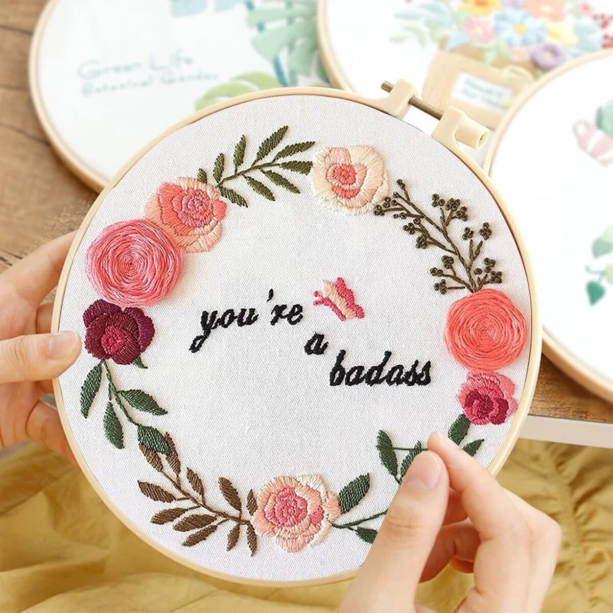 This inspirational embroidery kit is adorned with vibrant flower motifs and cheeky phrases, elevating your crafting experience.