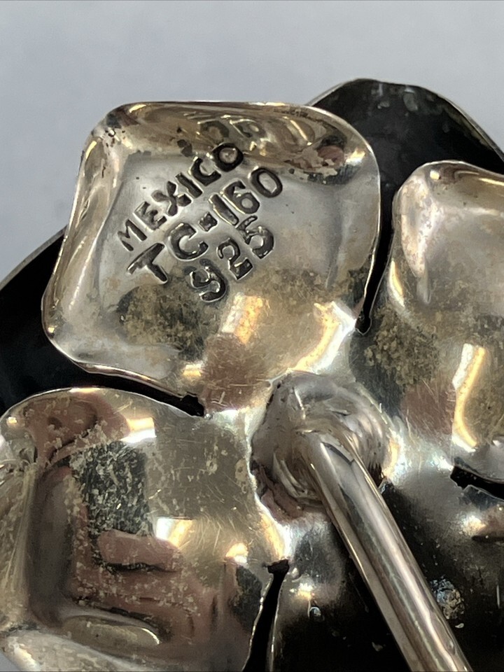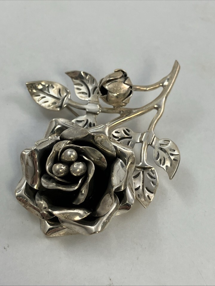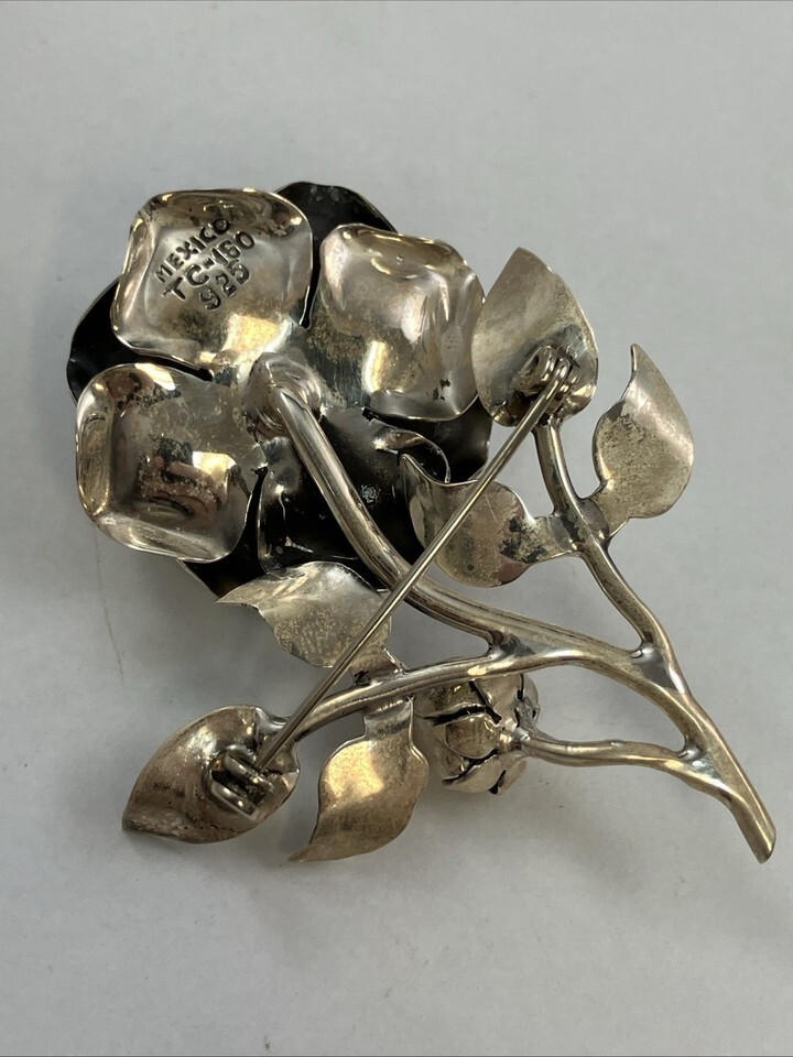VTG 925 Mexico TC-160 Sterling Silver 2.5” Rose Pin Brooch Taxco Signed 20.7g