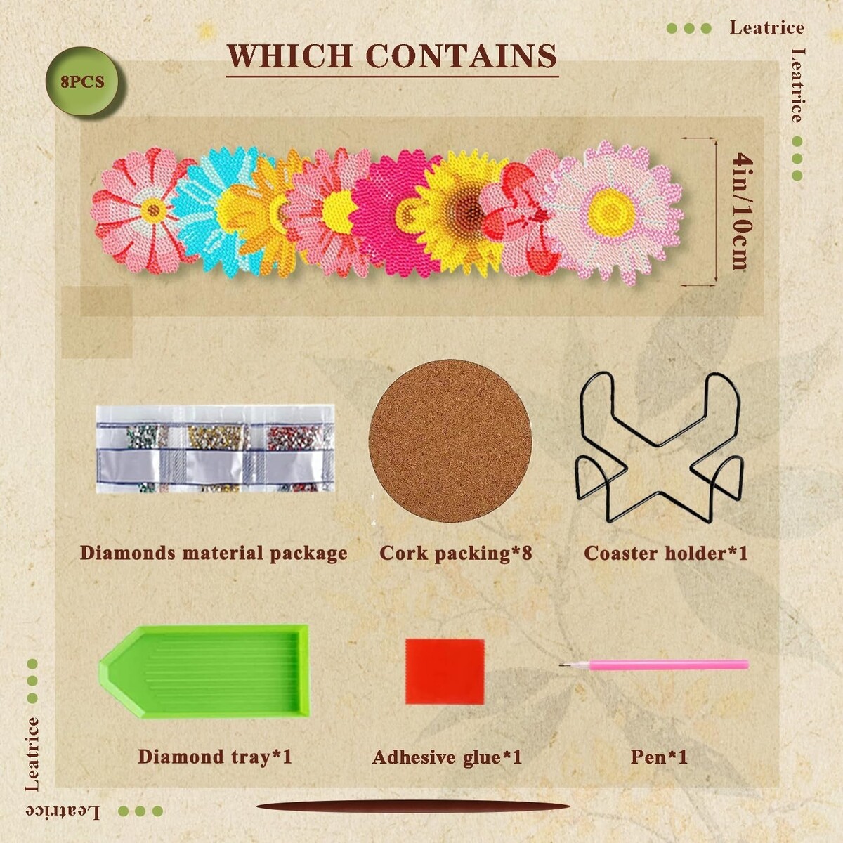 Includes 8 round diamond painting coasters, a coaster holder, diamond painting pens, red glue clay, and plastic trays.