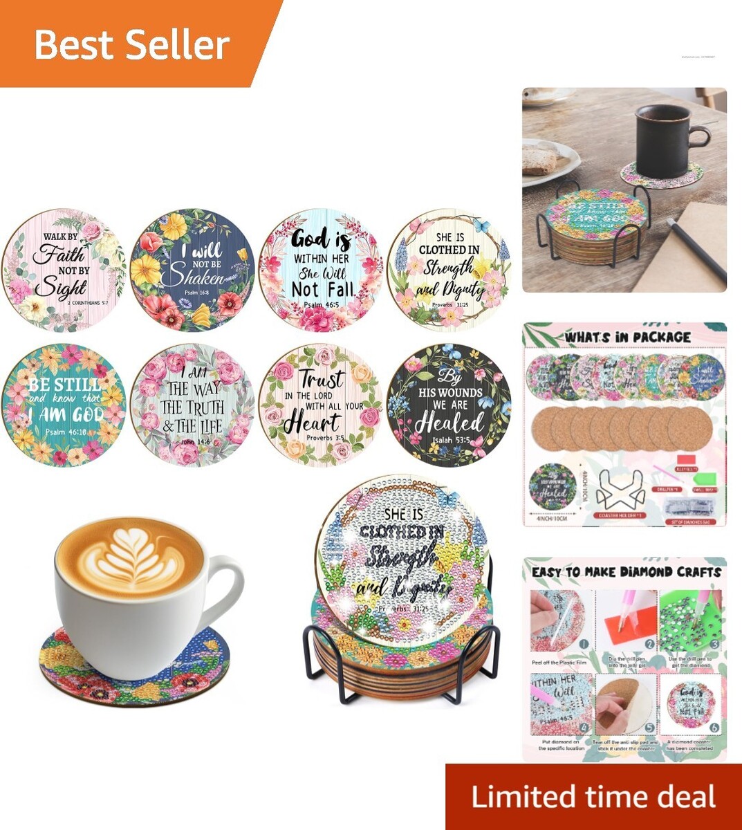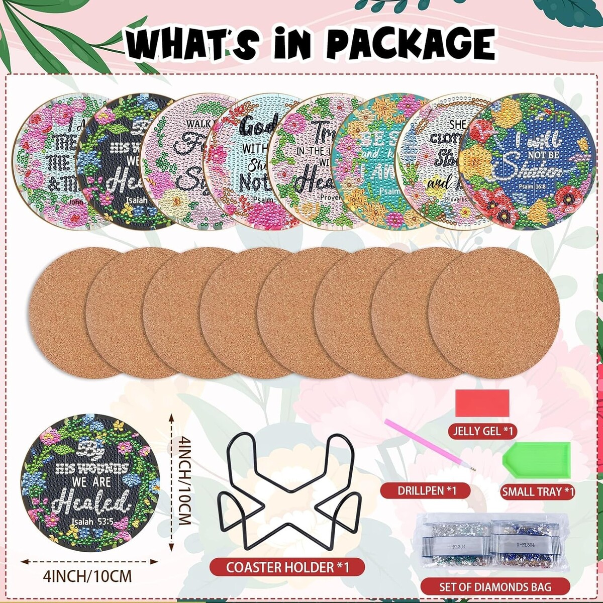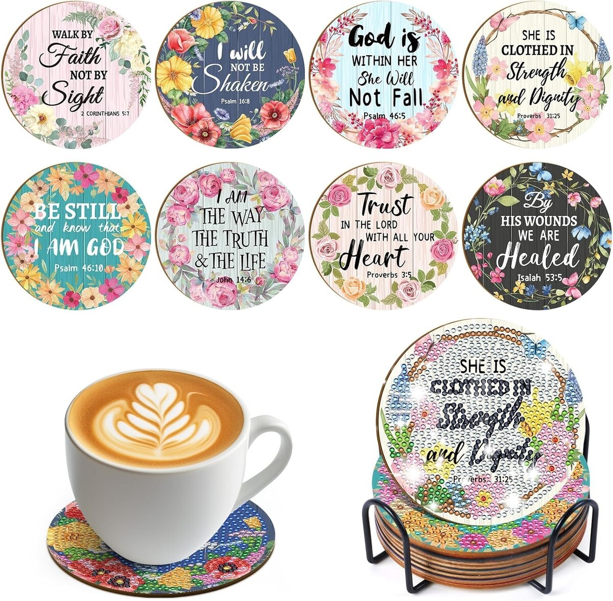 8 beautifully crafted Christian Bible verse diamond painting coasters (4 inches in size).