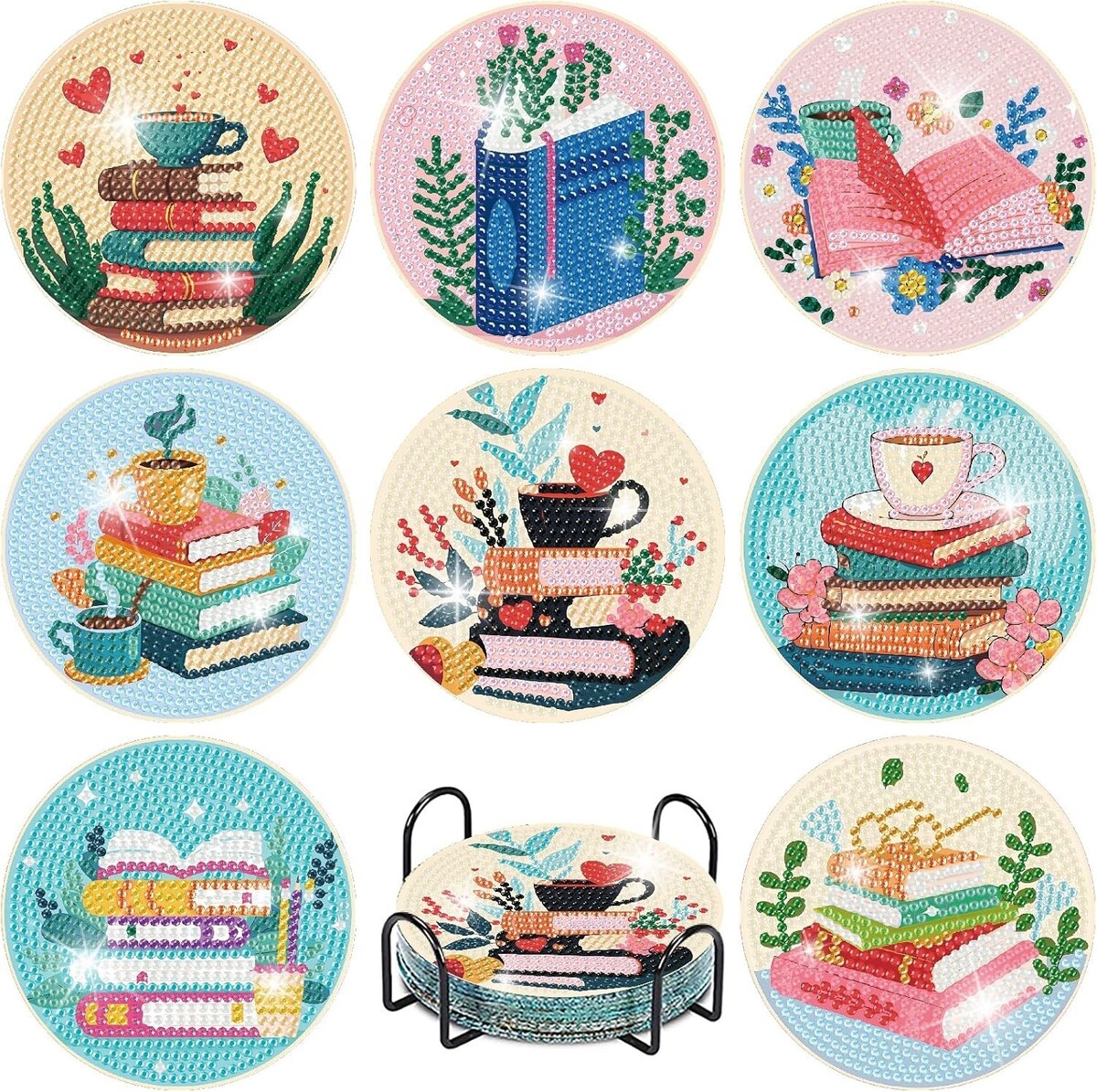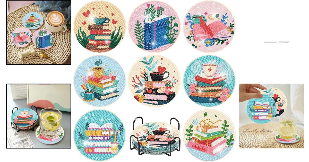 8 Diamond Painting Coasters featuring mesmerizing book-themed art.