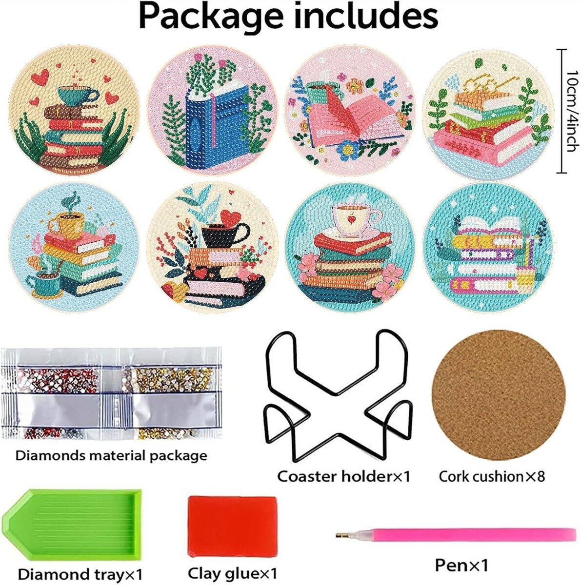 Bundled Items: Coaster Holder,Diamond Painting Coaster,Cork Pad,Clay Glue,Diamond Painting Pen,Diamond Dot Tray