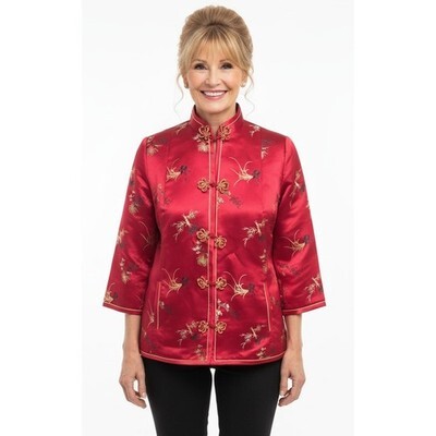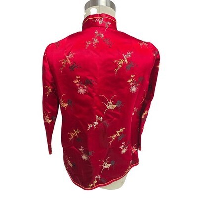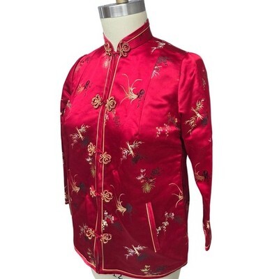 VTG 60s-70s Cherry Red Silk Satin Damask Lounge Jacket w/ Pockets & Vented Hem M