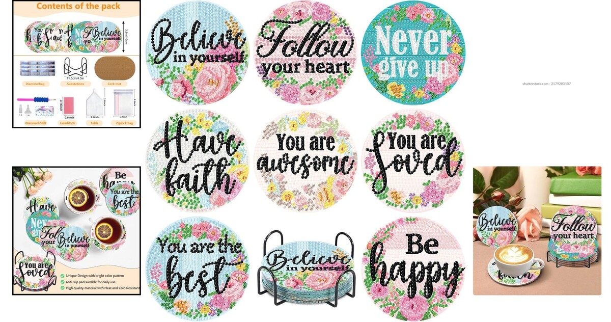 Floral Diamond Art Coasters - 8 PCS Inspirational Coaster Kit for Creative Gifts