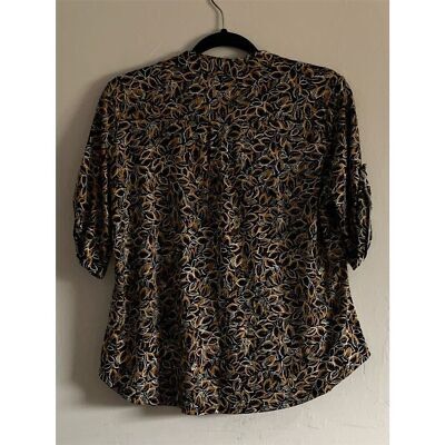 Keywords: Per Seption Petite, women's blouse, multicolor, floral pattern, V-neck, bell sleeves, casual wear, spring fashion, relaxed fit, breathable fabric, pre-owned, medium size, 3/4 sleeve, lightweight, everyday style.