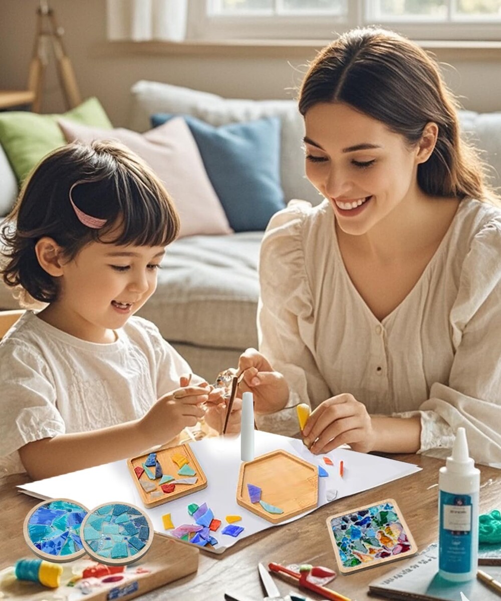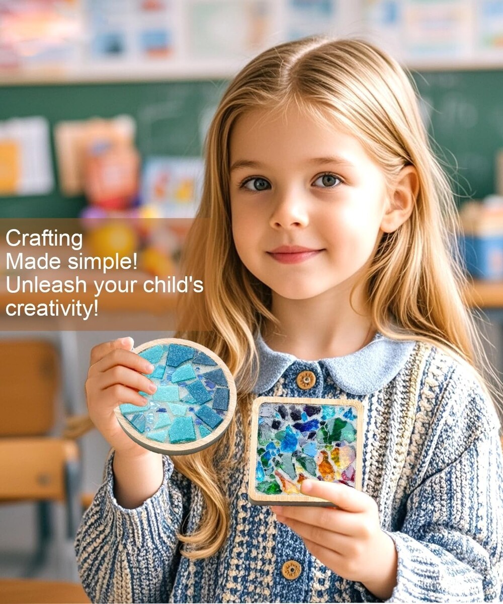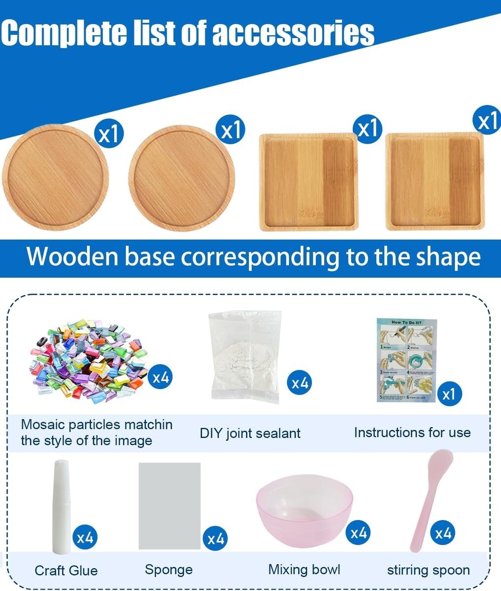 Mosaic Kits for Adults Beginners: Each kit includes 4 unfinished wooden coasters, vibrant glass mosaic tiles, safe glue, caulk, sponge, and gloves.