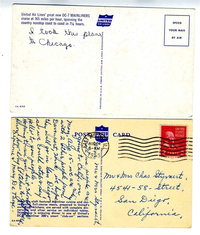 There are 2 different United Airlines postcards in this lot. A United Airlines DC-6 Club Car postcard mailed in 1955 and a DC- 7 inflight unmailed but written on Postcard.