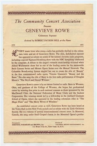 A 4 page Genevieve Rowe Program . Presented by the Community Concert Association in New York City in 1950. HAs the biography of this Coloratura Soprano on the front cover and program on the interior pages. he was known for her performances in Operas on the Radio