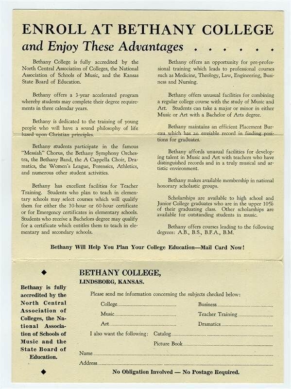 A trifold advertisement for the Bethany College in Lindsborg, Kansas printed on heavy card stock and mailed. With intact business reply card. These were sent to girls just graduating from high school to get them interested in a career in business. In very good condition.