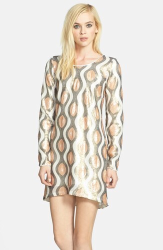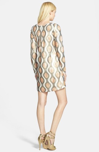 Wavy sequin patterning creates undulating shimmer atop a leg-maximizing shift dress styled with a round neckline and long sleeves. An inverted back pleat accentuates the flowy silhouette.