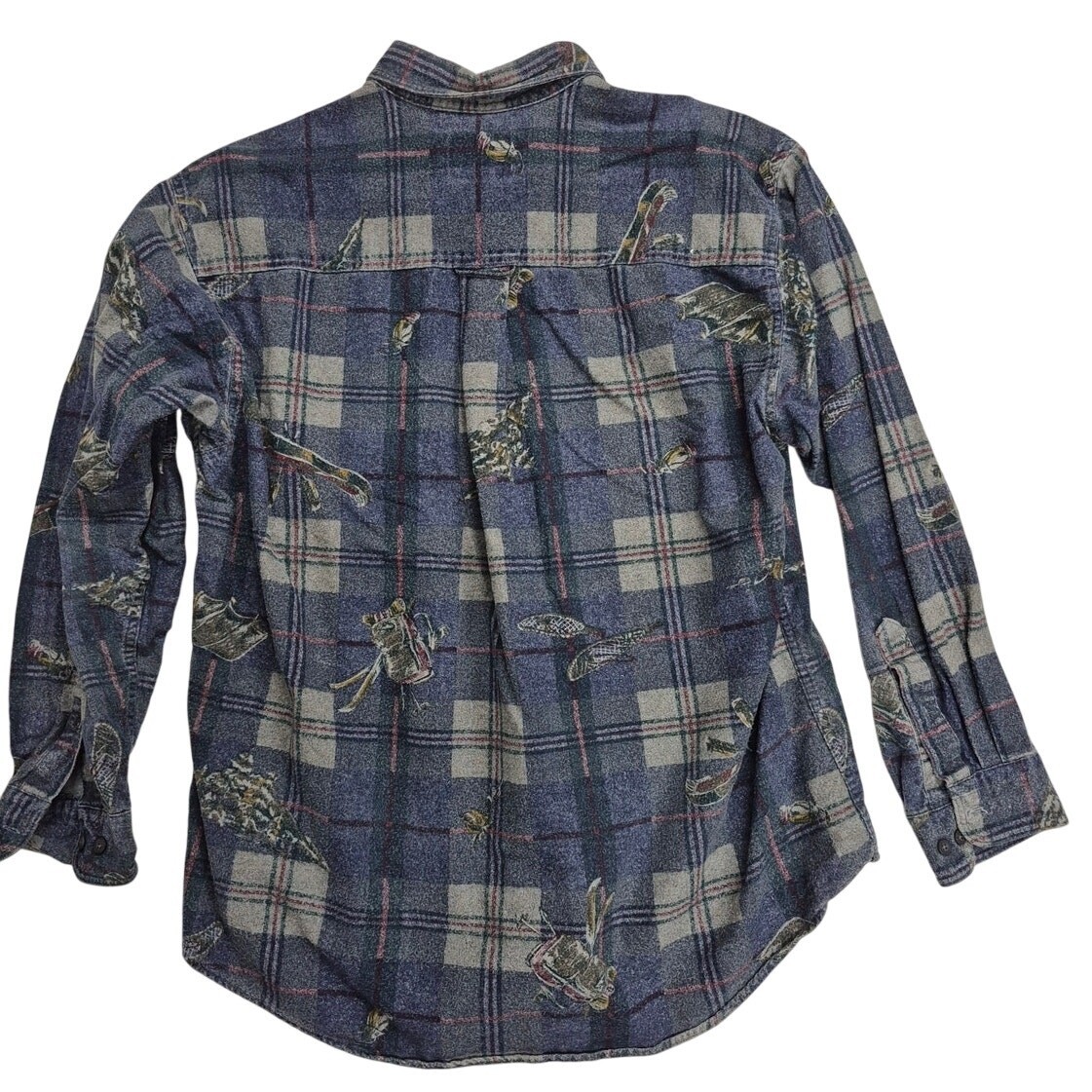Vtg 90s Woolrich Cotton Flannel Camping/ Canoeing Theme All over Blue/Gray Sz L