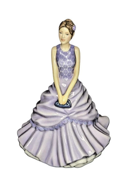 Designed by artist Neil Faulkner, Ava is an exquisite, petite figurine dressed in a beautiful, multi layered lilac gown with a delicately ruched top layer edged with layered lilac gown with a delicately ruched top layer edged with purple lace above another with cascading lilac folds. Overlaid with intricate purple lace, her elegant, sleeveless bodice offsets her pretty dark brown hair, twisted into a bun and sidea bun and side clipped with a floral detailed hairpin, leaving some loose strands clipped with a floral detailed hairpin, leaving some loose strands framing her face. Smiling sweetly Ava is truly belle of the ball and holds her matching clutch bag in both hands.Crafted in exquisite fine bone china, Royal Doulton figures are beautifully handmade and hand decorated by skilled ceramic artists. The production of this delightful figurine is strictly limited to 2020 , the year of issue.