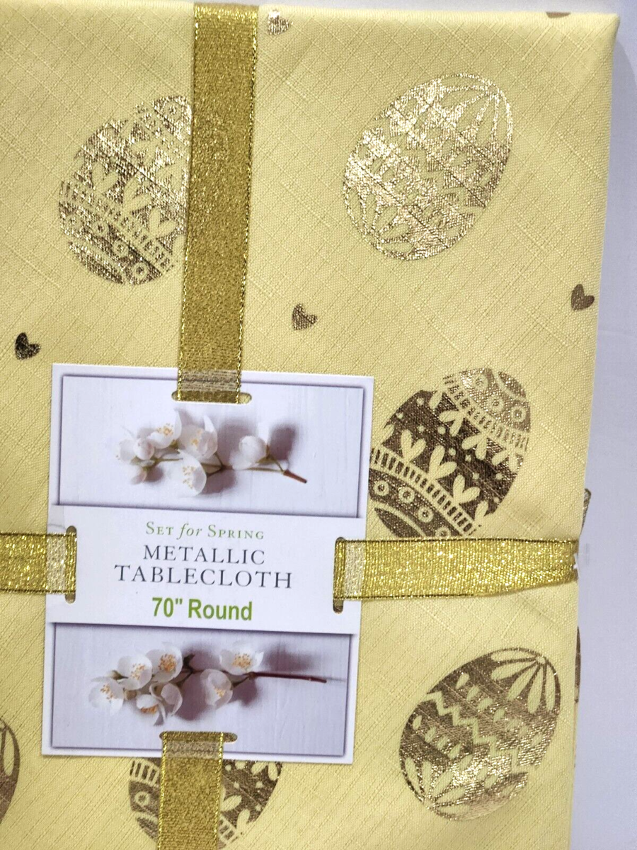 Up for sale is this adorable tablecloth for your Easter table. The tablecloth is sooo pretty! Tablecloth is yellow with gold metallic eggs. 70" round. New