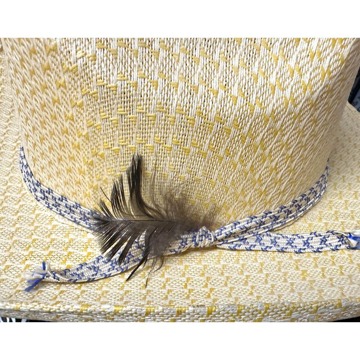 It has a yellow embossed straw and a blue and white ribbon with feathers. It is in new condition, and it still has a paper tag. Front to back it is 15", with an almost 6" tall crown. The brim is app. 3.5" wide all around.