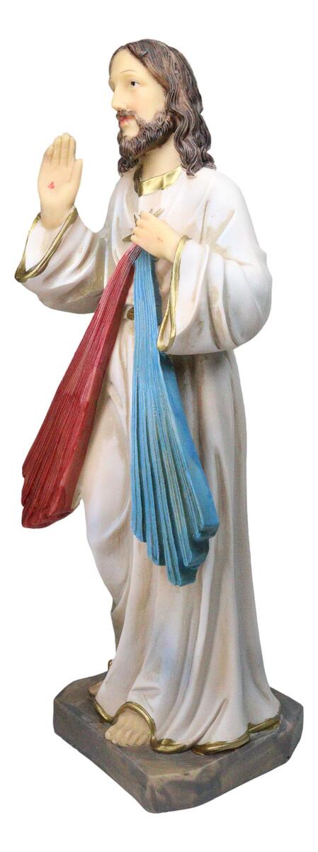 ? This sculpture of Divine Mercy is hand painted and casted in high quality resin. The Divine Mercy is a devotion to the merciful love of God and the desire to let that love and mercy flow through one's heart towards those who needs it. The image of Divine Mercy shows Jesus raising His right hand in blessing, and the left pointing to His heart with rays streaming out with red symbolizing the blood of Jesus and the other symbolizing water.