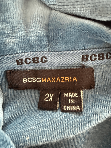 BCBGMaxAzria teal blue velour, peacock and floral embroidered and embellished full zip hoodie. BCBG and flowers embroidered and lightly beaded at the left chest, branded zipper pull and large embroidered, sequin and lightly beaded Peacock and flowers across the back. Cotton and polyester blend. Tag size 2X. Lane flat measures 25 inches shoulder to hem and 24.5 inches armpit to armpit.