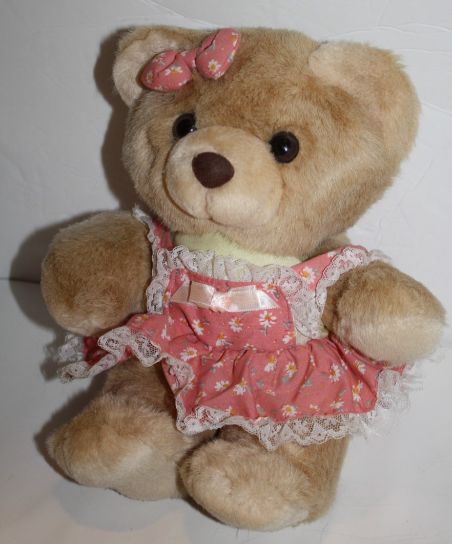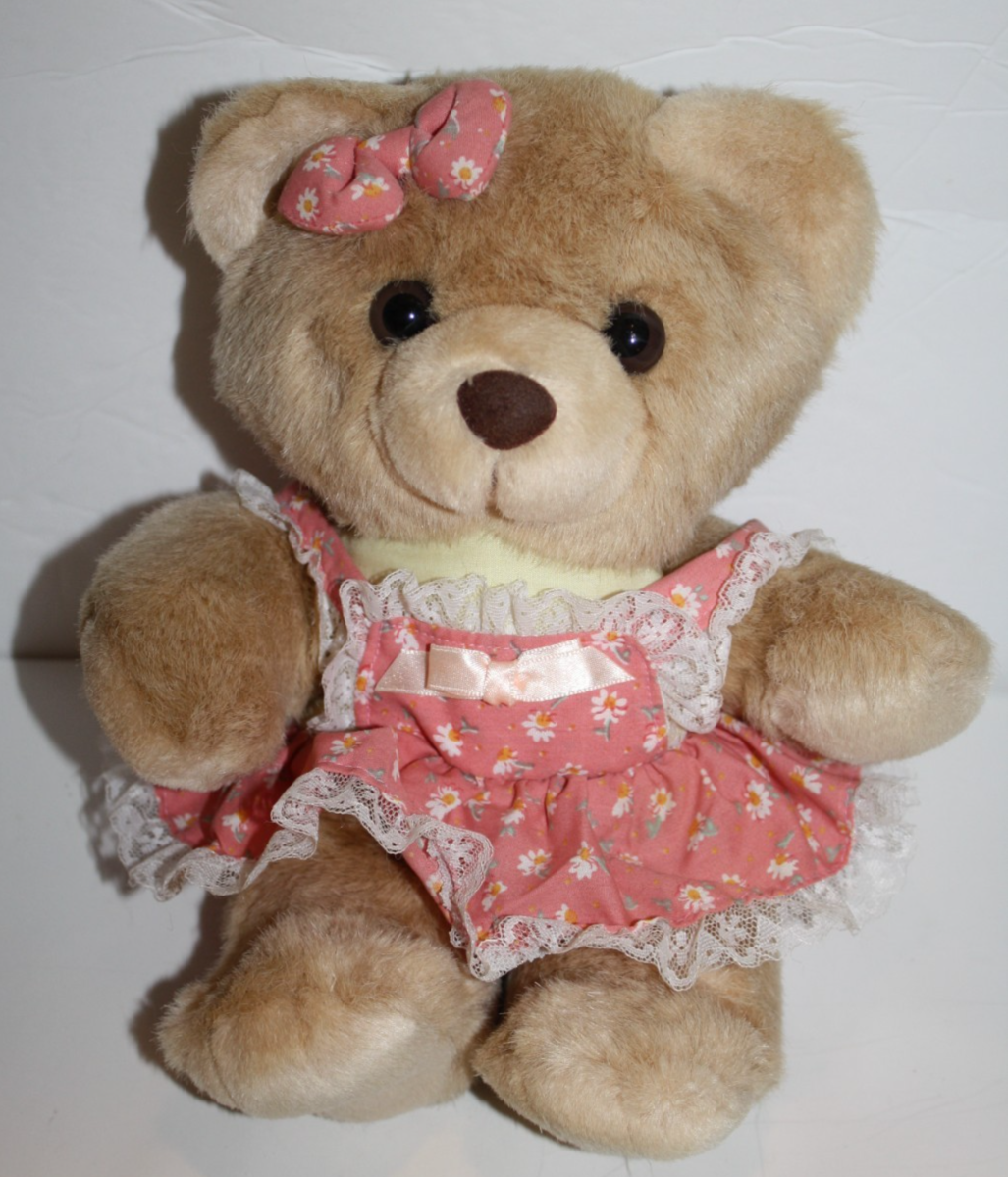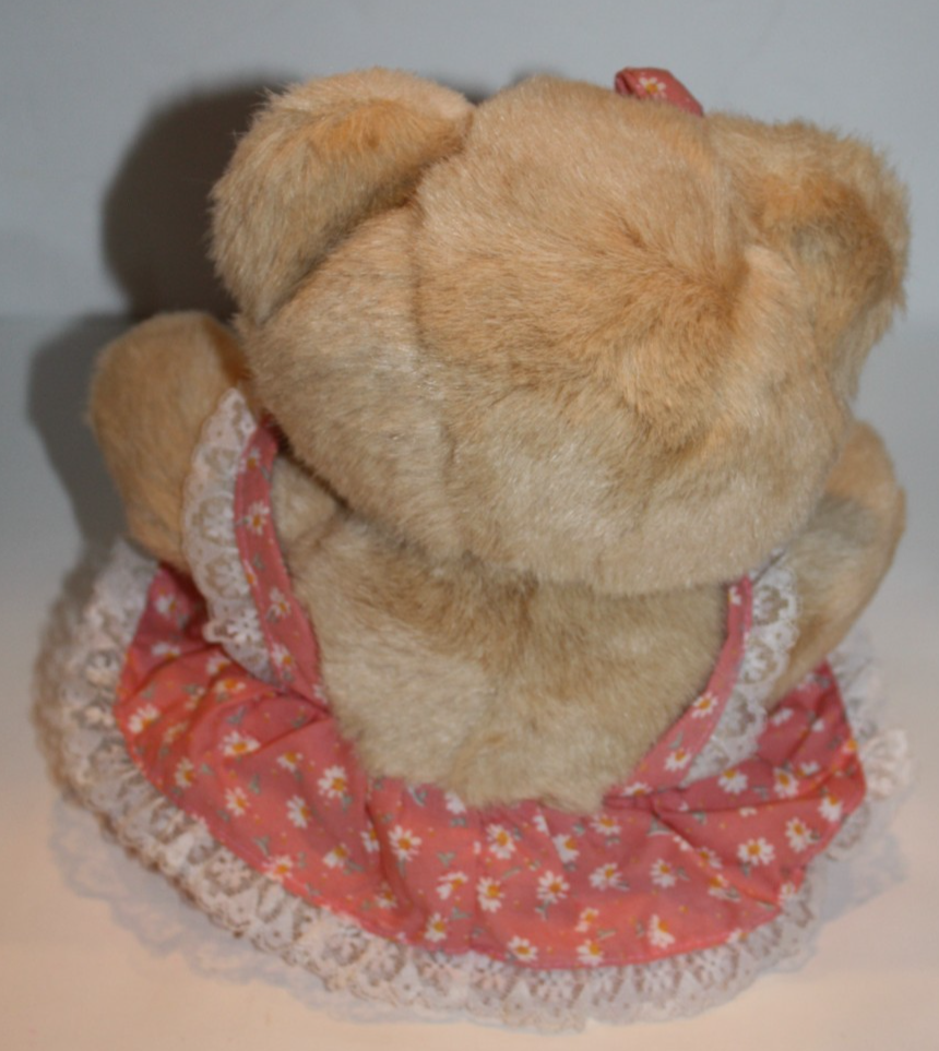 Walmart, Teddy Bear, Sits Approx 9", Beige, Plush, Peach Pinafore Flower Dress, Bow, Soft Toy, Stuffed Animal, Brown Plastic Eyes and Brown Flocked Nose