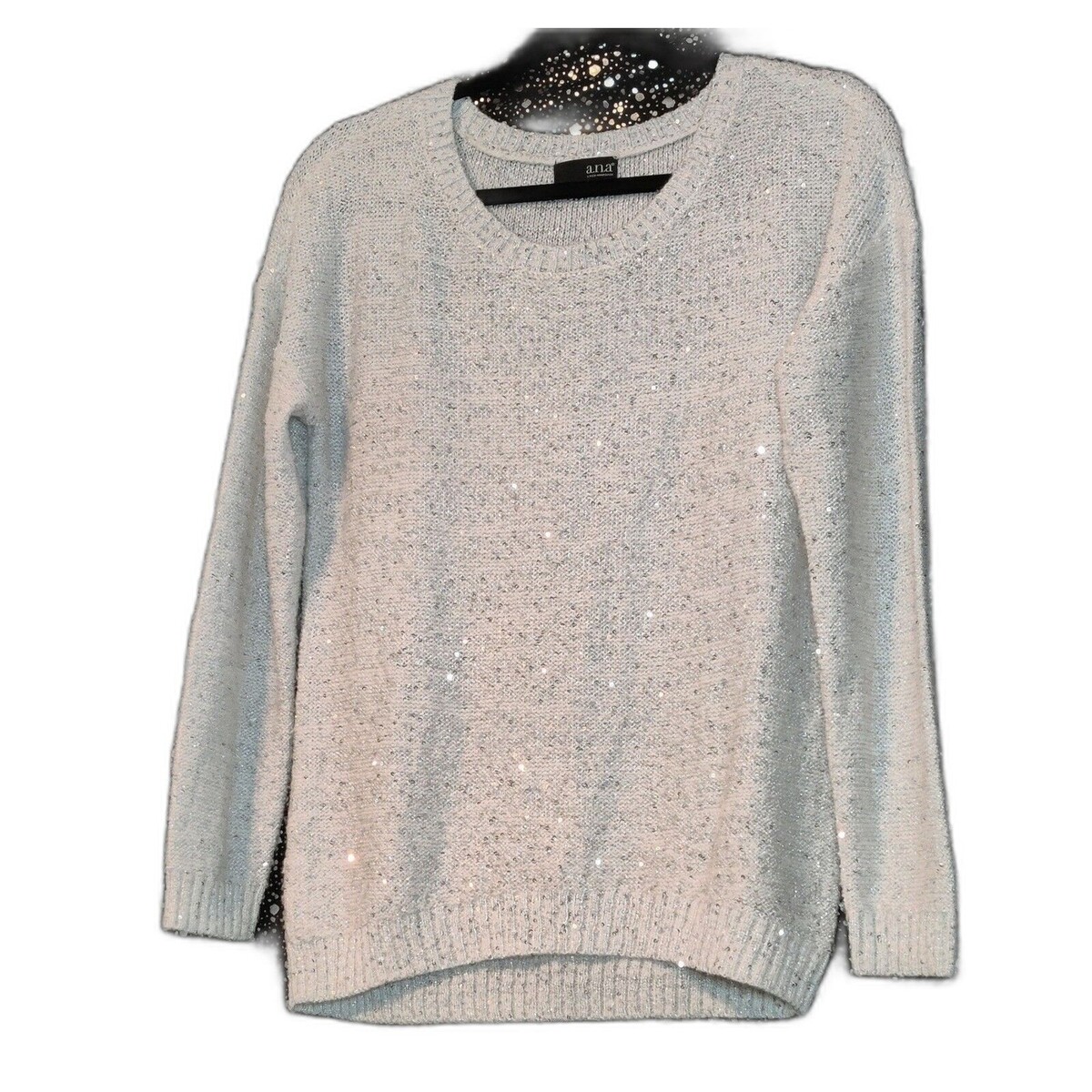 Keywords: ANA, sequin sweater, sparkle knit, crew neck, long sleeve, light blue, shimmer, festive, glamorous, holiday, evening wear, metallic threads