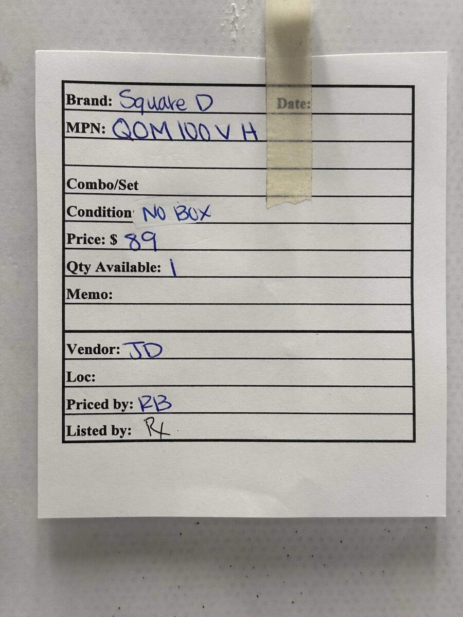Square D QOM100VH 100A 2-Pole Bolt-On Main Circuit Breaker 120/240V New - No Box The Square D QOM100VH is a 2-pole miniature circuit breaker designed for reliable overcurrent protection in residential and commercial electrical systems. It is rated for 100 amps at 120/240 VAC and offers a high interrupting capacity of 22 kA to safely handle fault conditions. This breaker uses a thermal-magnetic trip mechanism with a quick make, quick break toggle action to help protect wiring and connected equipment. The bolt-on mounting design makes installation into compatible QO load centers fast and secure. Listed by: Richard (Sales Team) ?The road to success has many potholes... knowing how to dodge them ahead of the collision will pave our way in reaching our journey.? R. Weckworth (A positive moment brought to you by Help Resale) About Us Welcome to Help Resale, your go-to consignment shop where value meets quality. At Help Resale, we're dedicated to providing you with an exceptional shopping experience, whether you're looking to find the best deals or consign your items. Need to buy a product, but don't see it in our store? Please feel free to reach out to us and we will help you find it! Help Resale 7200 Fair Oaks Blvd Suite 120 Carmichael CA 95608 Business Hours: Monday-Friday: 9:00 am to 5:00 pm (PST) All product and company names are trademarks TM or registered trademarks of their respective holders. Use of them does not imply any affiliation with or endorsement by them.