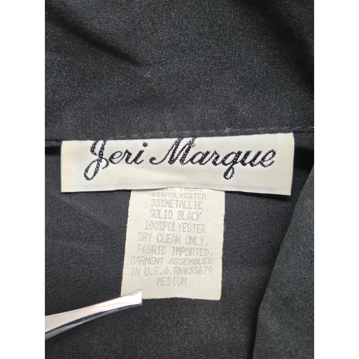Labeled Jeri Marque, a U.S.-based label known in the 1980s for statement blouses featuring metallic threads, sheer fabrics, and bold surface design. Tag indicates fabric imported, with garment assembled in the U.S.A., a common production method for higher-quality 1980s womenswear.