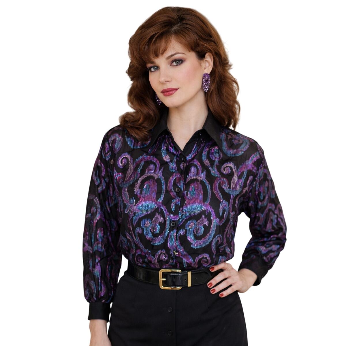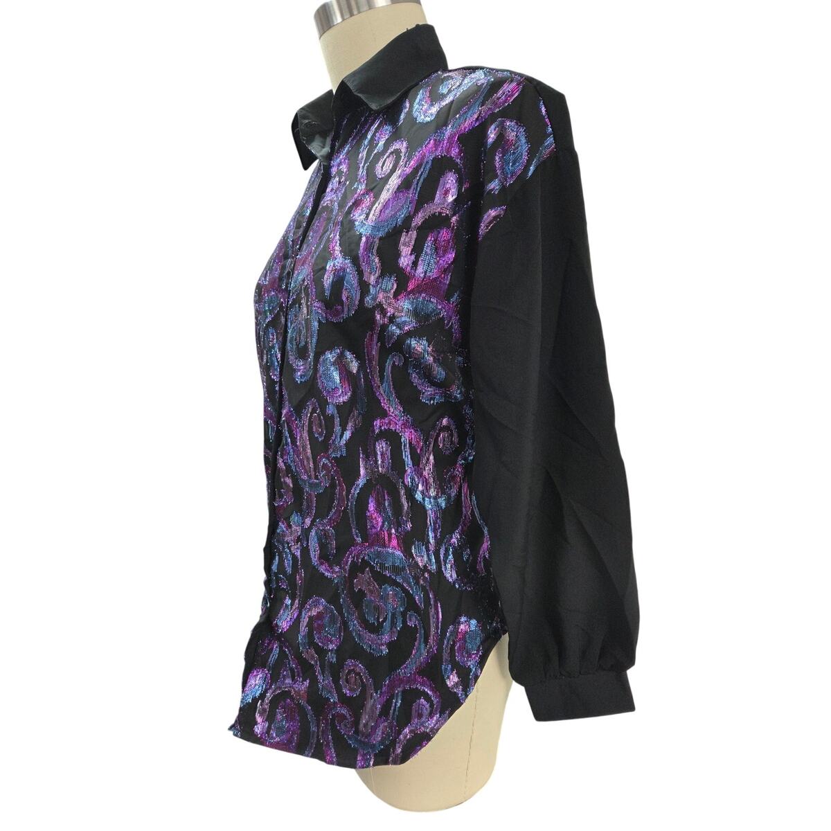 VTG 1980s Jeri Marque Metallic Scroll Blouse Black Purple Teal Button Down