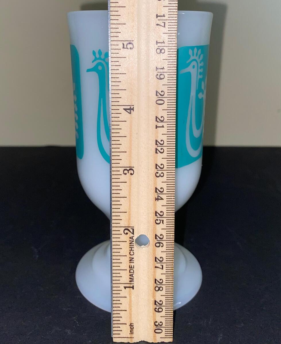 Add a touch of retro charm to your kitchen with this rare set of six vintage Mid-Century Modern Federal Glass pedestal mugs, featuring the highly collectible "Danish Rooster" or "Danish Bird" design. These heat-proof continental cups, produced in the USA around the 1960s, are made of opaque white milk glass with a vibrant turquoise/aqua blue graphic and a footed base with an angular handle. The set is in excellent vintage condition with no chips, cracks, or staining, and minimal paint loss, making them perfect for Irish coffee, hot chocolate, or as a stunning addition to any MCM or farmhouse collection; hand washing is recommended to preserve the decals.