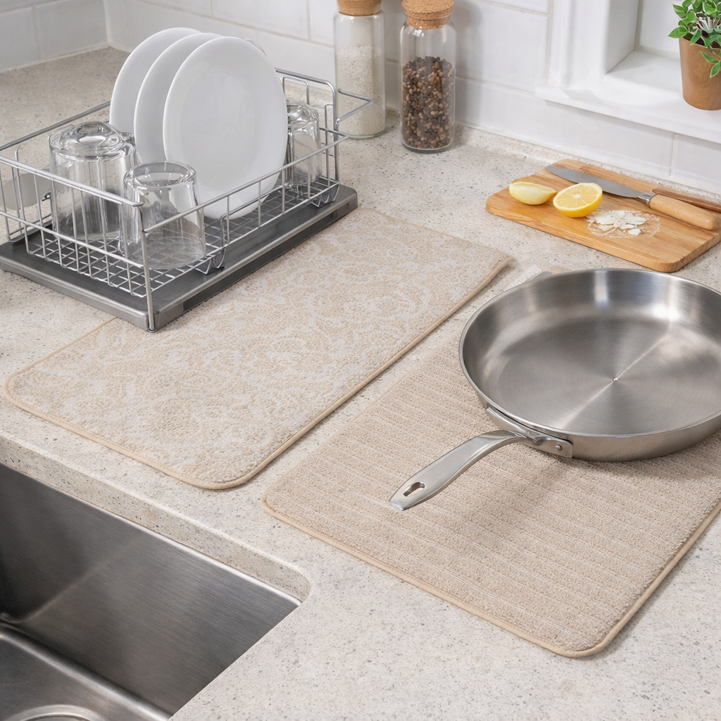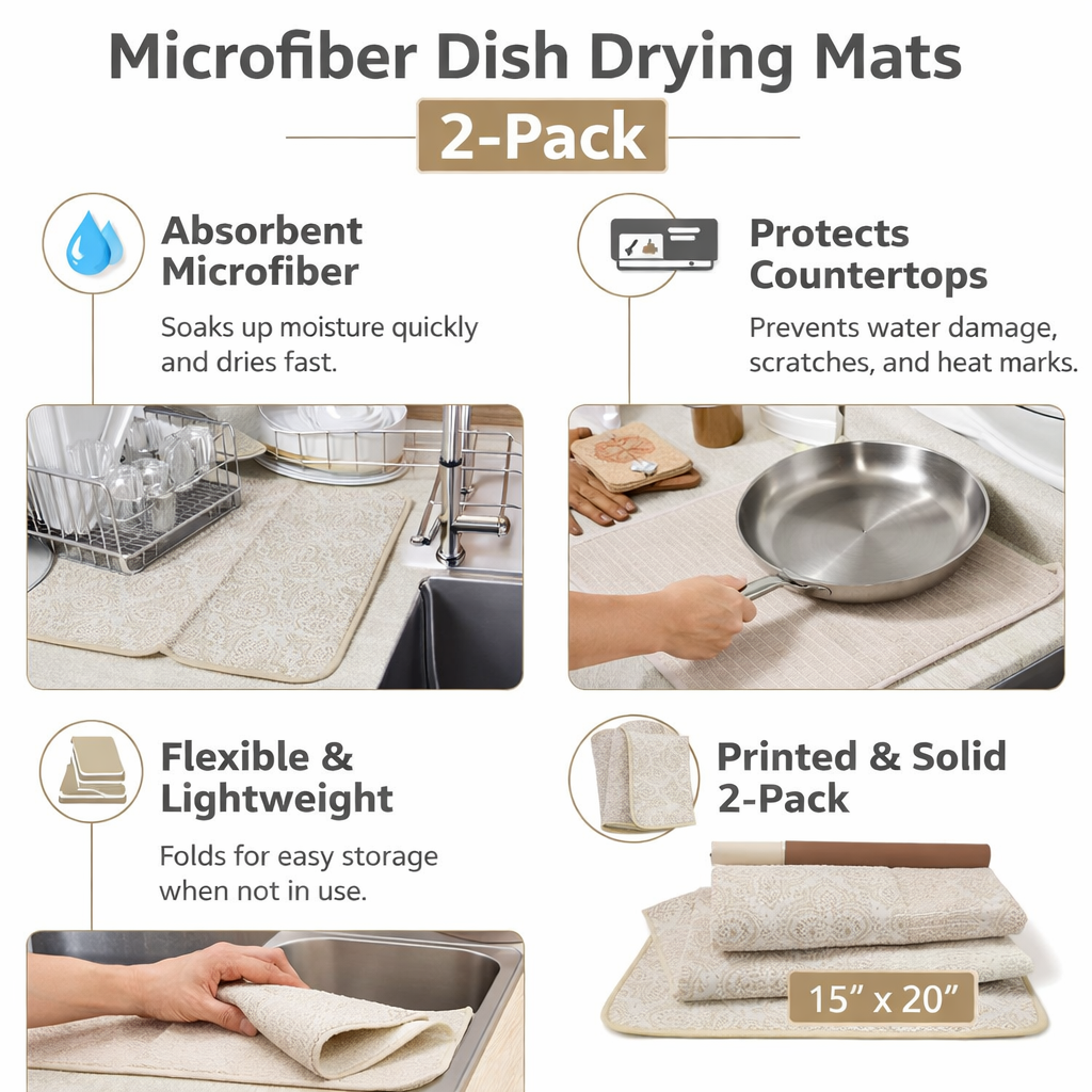 This 2-pack microfiber dish drying mat set includes one printed mat and one solid color mat, designed for everyday kitchen use. Made from absorbent microfiber, these mats help soak up excess water and dry quickly, keeping countertops cleaner and drier.