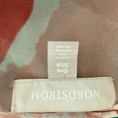 From Nordstrom, lightweight and airy, sheer chiffon voile kaftan tunic that with a tank top can be worn as a top or could function as a swim cover-up. The only tag is the Nordstrom store tag and the one size fits most tag. There is no fabric content tag. The abstract print is in shades of orange, periwinkle blue, burgundy and ivory. 32 inches shoulder to him and hanging a little lower on the sides And 23 inches armpit to armpit.