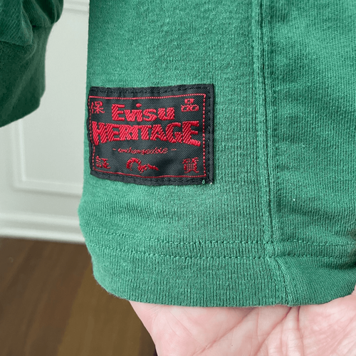 Evisu Men's T-shirt Long Sleeve Unchangeable White Heron Bird heavily Embroidered and detailed on green. 100% cotton. Tag size XXXL. Brand patches at the hem of each hip. The retail on this T-shirt is $205. Laying flat measures approximately 26 inches armpit to armpit and 33 inches shoulder to hem