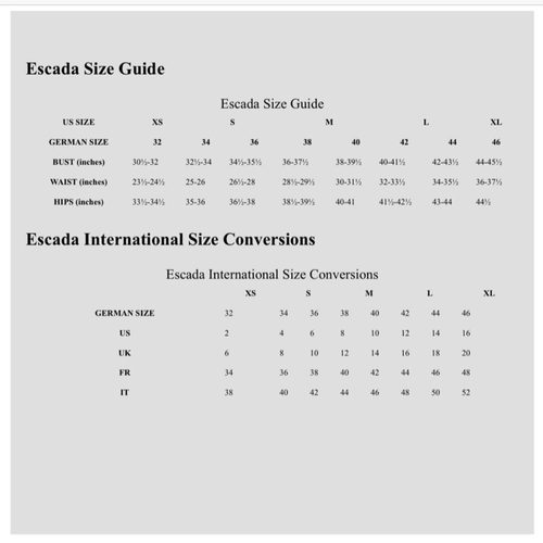 Escada luxury brand slim straight wool trousers with button and zip closure, and 2 shallow front hip pockets. Extra buttons on the inside tag. Measurements are approximate and taken while laying flat: 14.5? straight across the waist, 10? rise, and just shy of a 30? inseam. Tag size 36 which roughly translates to a US 6 or US size small. See attached size chart