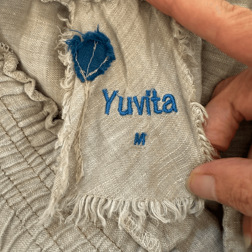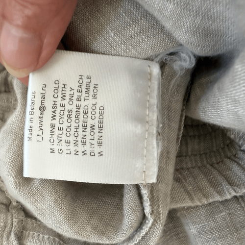 Yuvita Linens flax color, wide leg crop pants made of 100% linen. Pleaded front with hip pockets and front center zip pocket that is not very deep but good enough to hold a card or key. High rise with a 13 inch rise. Measures 14.5 inches straight across the wide band elastic waist and 22 inch inseam. The leg opening is 15 inches straight across the hem. $100 retail. Made in Belarus.