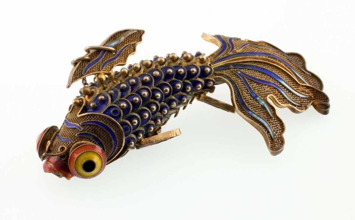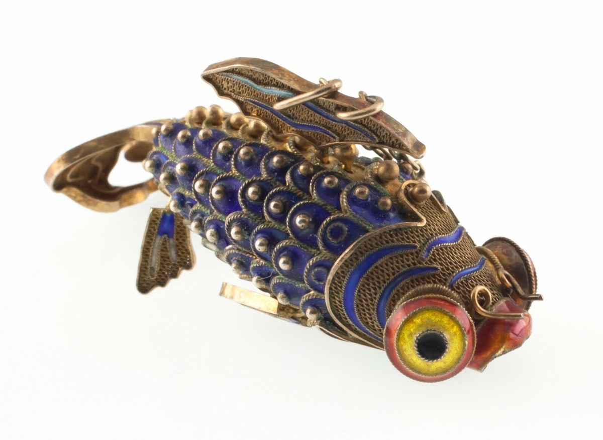 Vermeil Vintage 1920s Chinesisch Artikuliert Cloissone Filigraner Koi Fisch