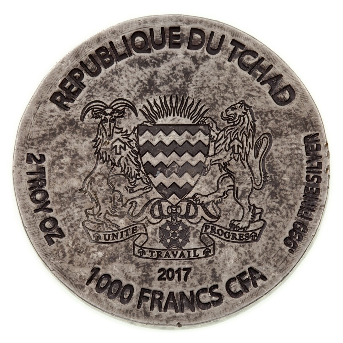 Face: Armoiries avec supports ( crest national de la Republique du Tchad), date et valeur en bas, poids et titre a gauche et a droite