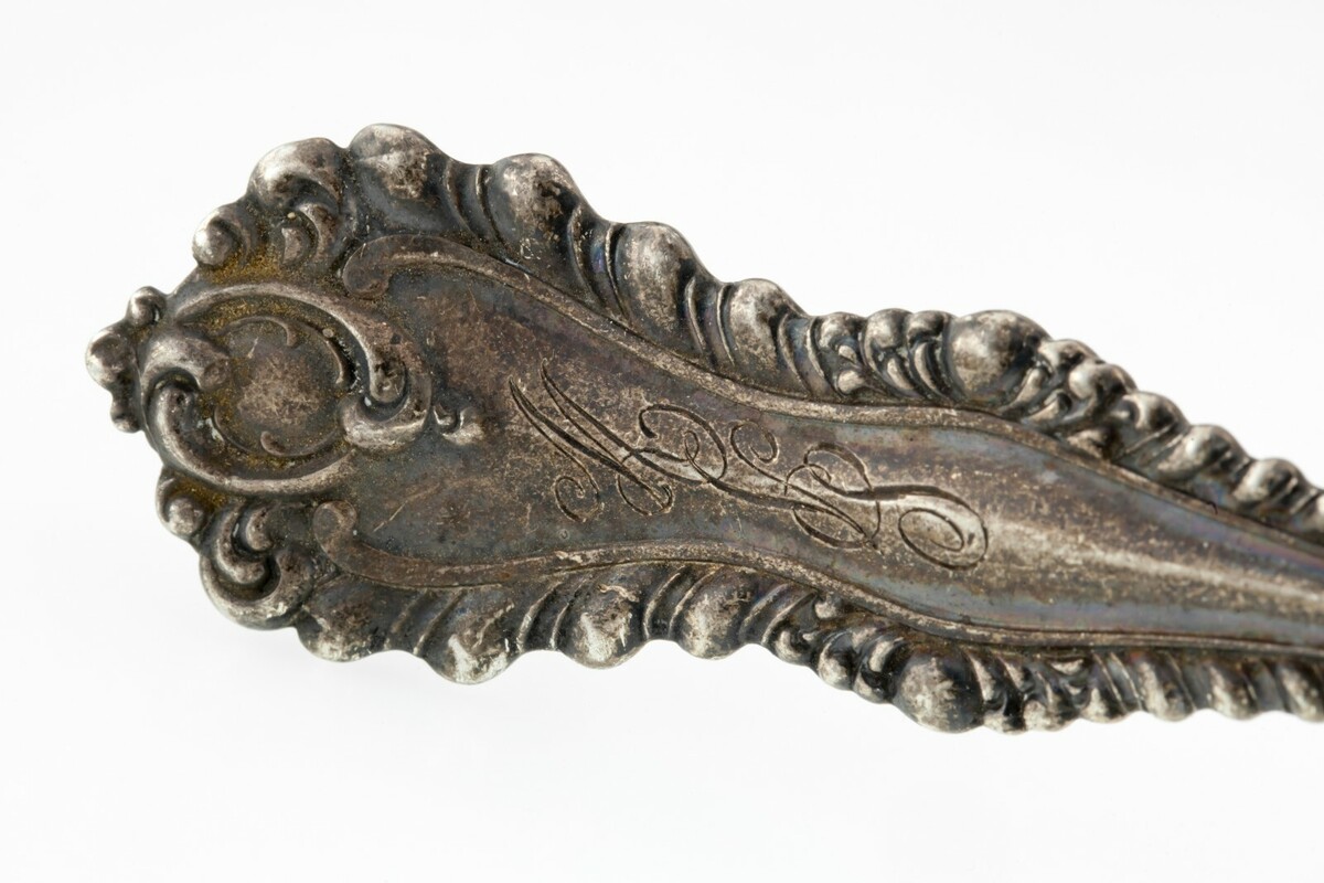 La cuchara esta en buenas condiciones. Sin abolladuras u otros problemas importantes. Bonita patina oscura con monograma visible.