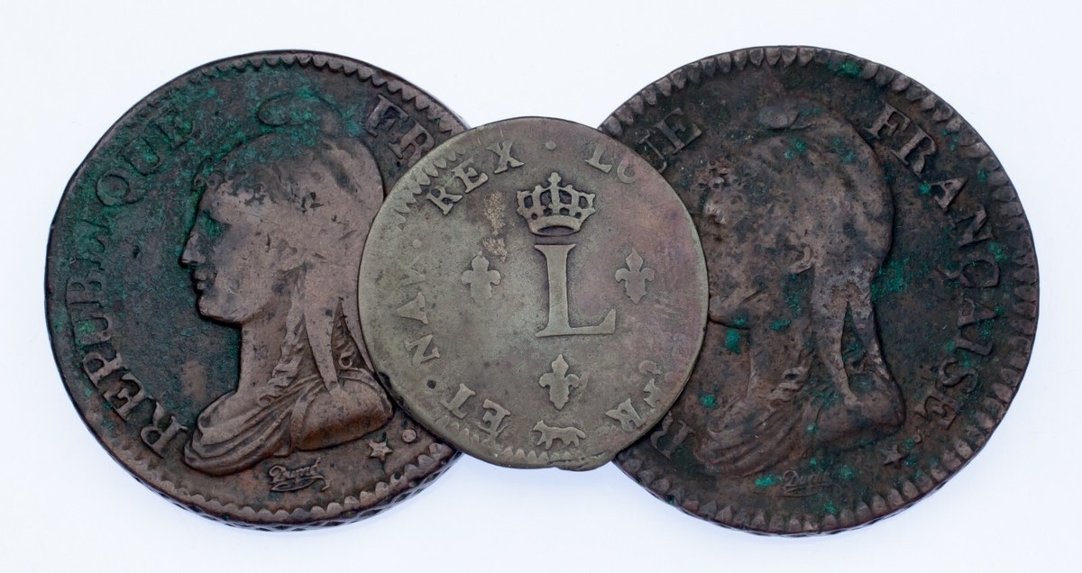 Lotto di 3 monete di bronzo francesi 1754-1799 Condizioni VF