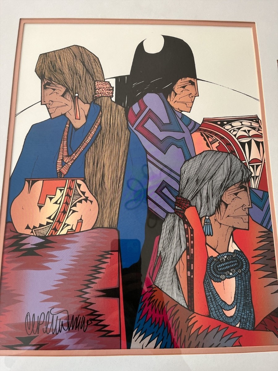 Striking framed art print by renowned Southwest artist Amado M. Peña Jr., depicting three Native American figures in traditional dress rendered in bold color, strong linework, and geometric textile patterns. The composition reflects Peña?s signature style, blending cultural heritage, dignity, and modern graphic design. The print is signed in the lower left and professionally framed with a wood frame and double mat.