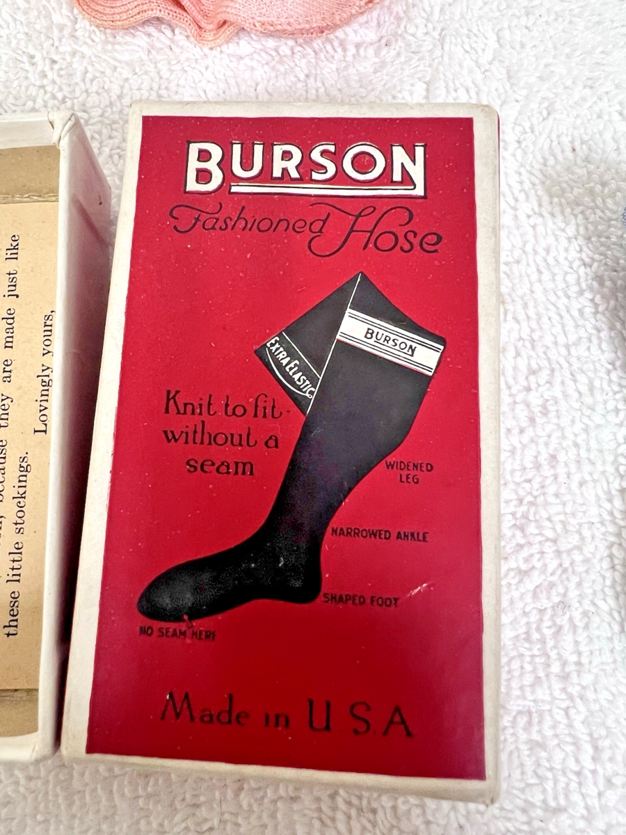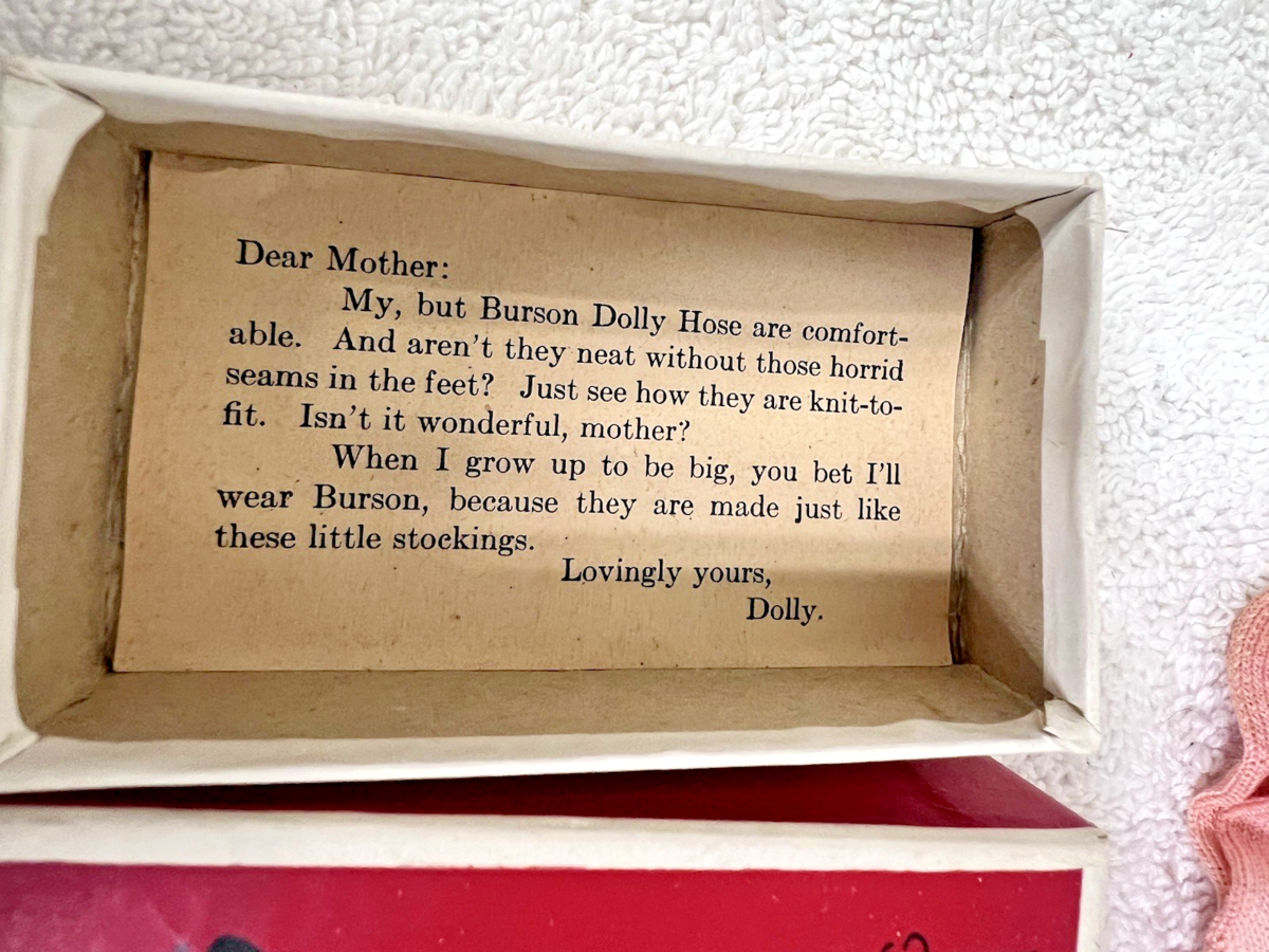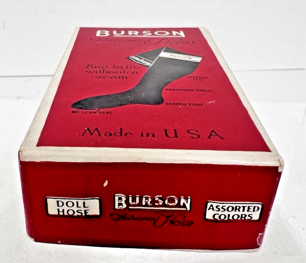 Vintage Childrens Burson Fashioned Hose Doll Pink Blue Miniature Socks Original Box. Cute red white box with black hose socks as part of advertising design measures approx. 3 1/4" x 1 7/8" x 1". Box is in great condition inside 2 pairs of miniature doll hose socks one pink, one blue, and original paper insert about the doll hose. Doll hose socks in good used condition, no holes or snags I see, blue pair could use cleaning. See pictures.
