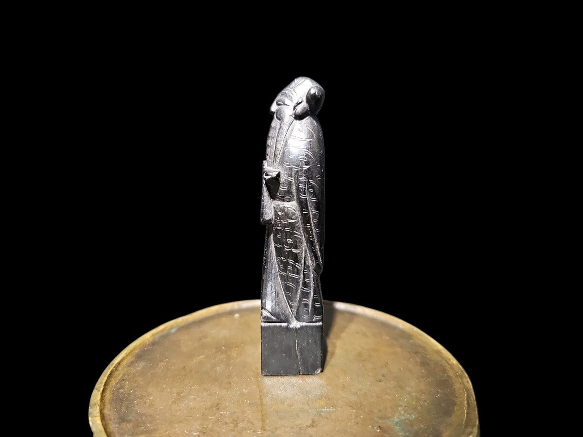 Chinese carved soapstone figural seal stamp, featuring a standing scholar or official figure with detailed robes and incised decorative motifs.