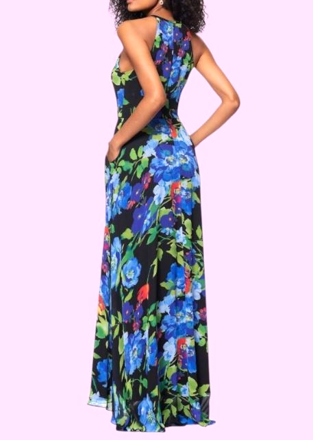A striking, elegant gown designed to make an entrance. This Betsy Adam chiffon dress features a flowing silhouette, bold print, and a flattering halter neckline?perfect for formal events, weddings, galas, or any special occasion where you want to stand out with effortless sophistication.