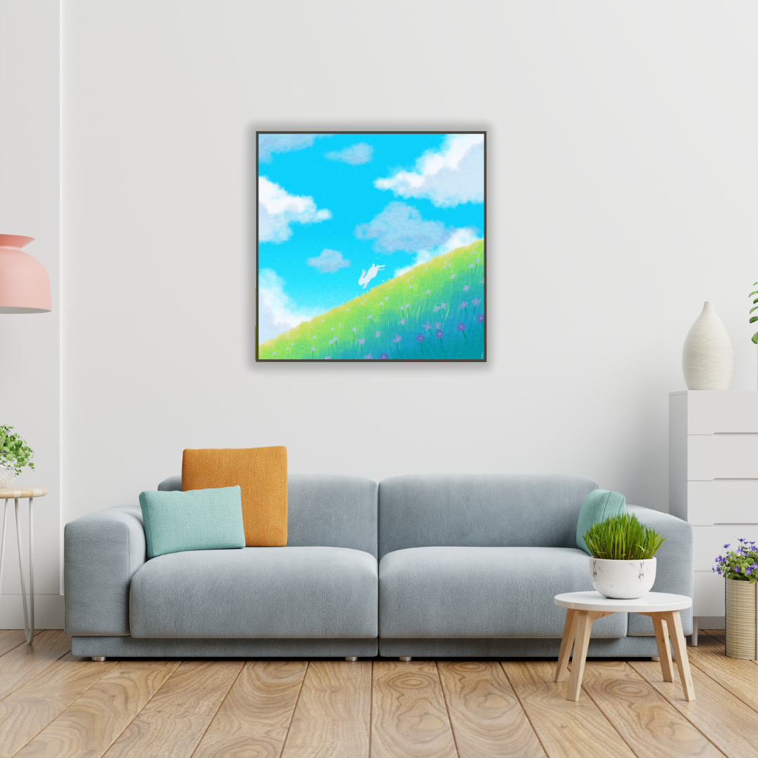 A Quiet Leap captures a moment of simple, unburdened joy as a lone bunny bounds through a sunlit field of flowers beneath a soft, cloud-dotted sky. The scene is calm and open, filled with light and gentle motion, where nothing is asked of the moment except to exist. The bunnyโs carefree leap reflects contentment in its purest formโmoving not toward a goal, but within the pleasure of the present. In this quiet space, happiness is found in small motions and open air, reminding us that joy does not always announce itself, but often appears in peaceful, fleeting moments.