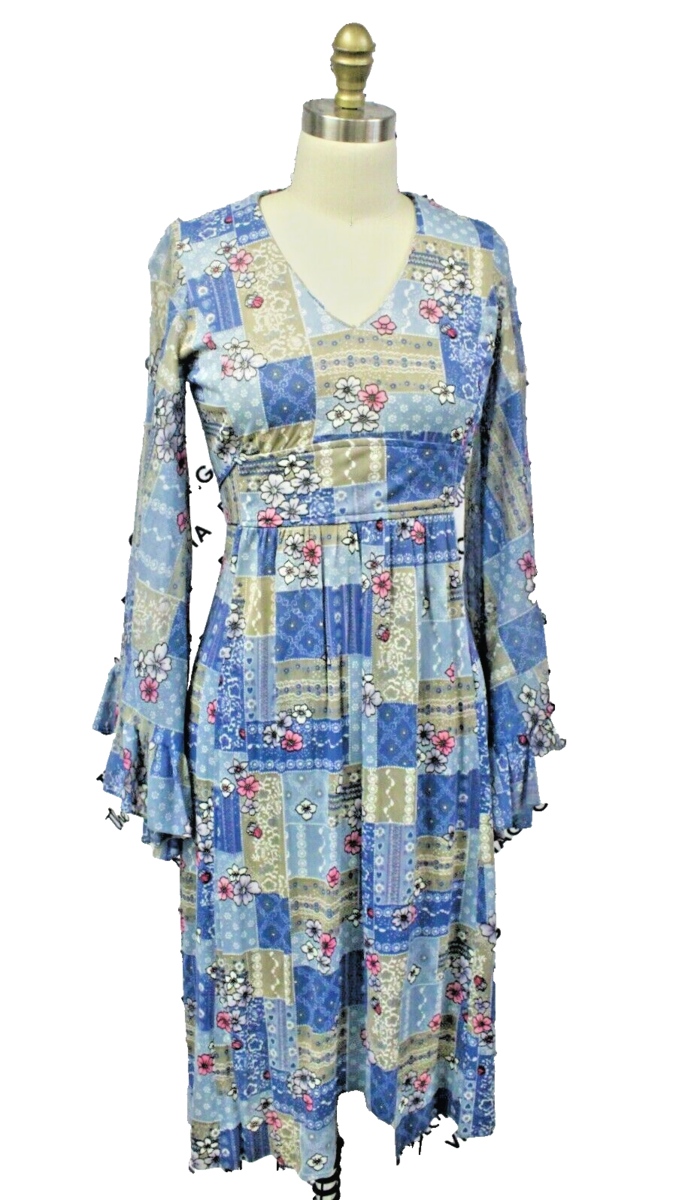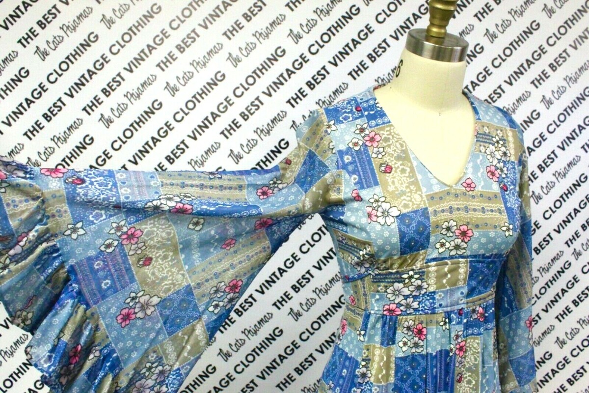 VTG 70s Prairie Cottagecore Blue Patchwork Floral Angel Sleeve Dress Boho 41”