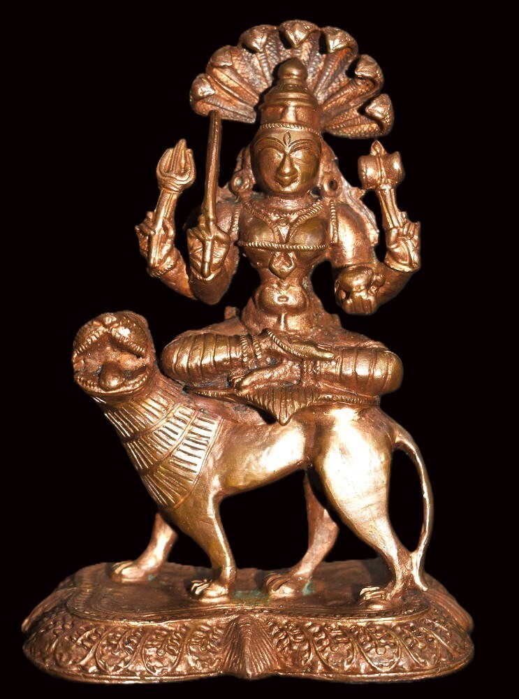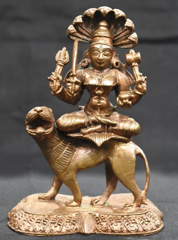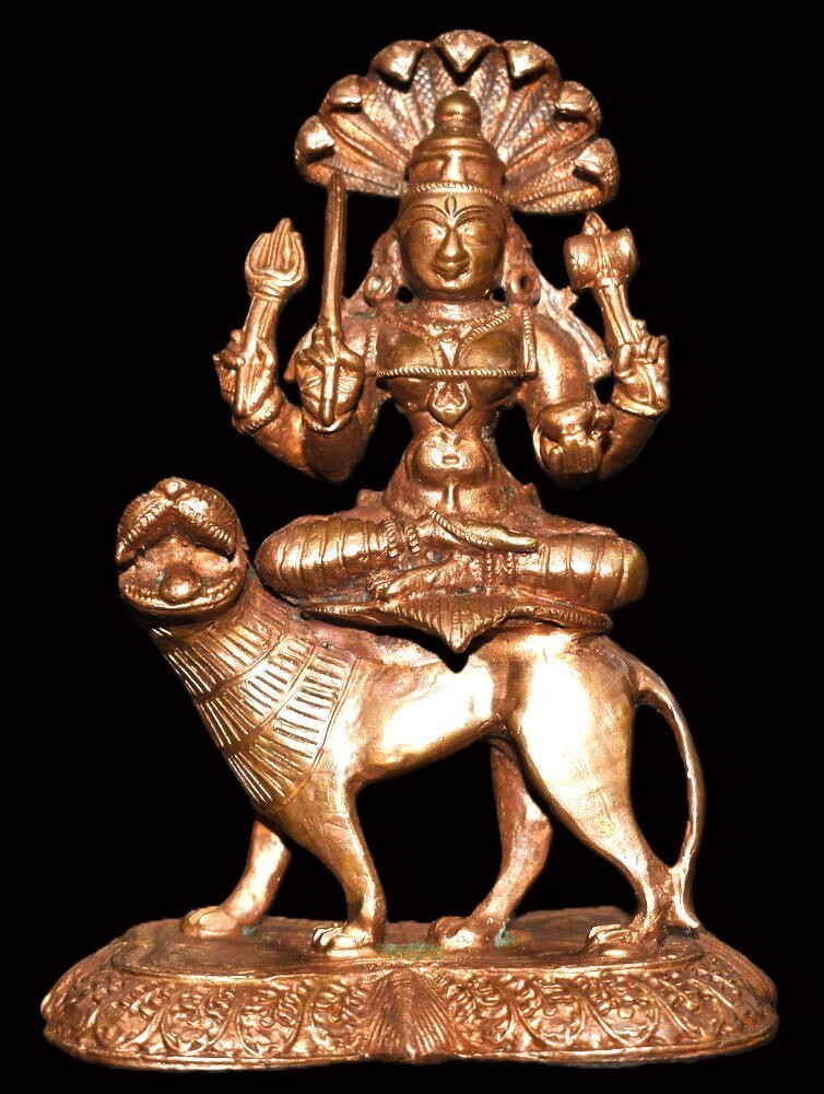 Design : Beautiful Goddess Angala Devi Idol seated on a lion artistically crafted in solid copper by skilled artisans of South India , Angala Devi Murti Seated under seven headed snake hoods on a Lion,having four hands holding a Sword, trident , Pot and Damru.