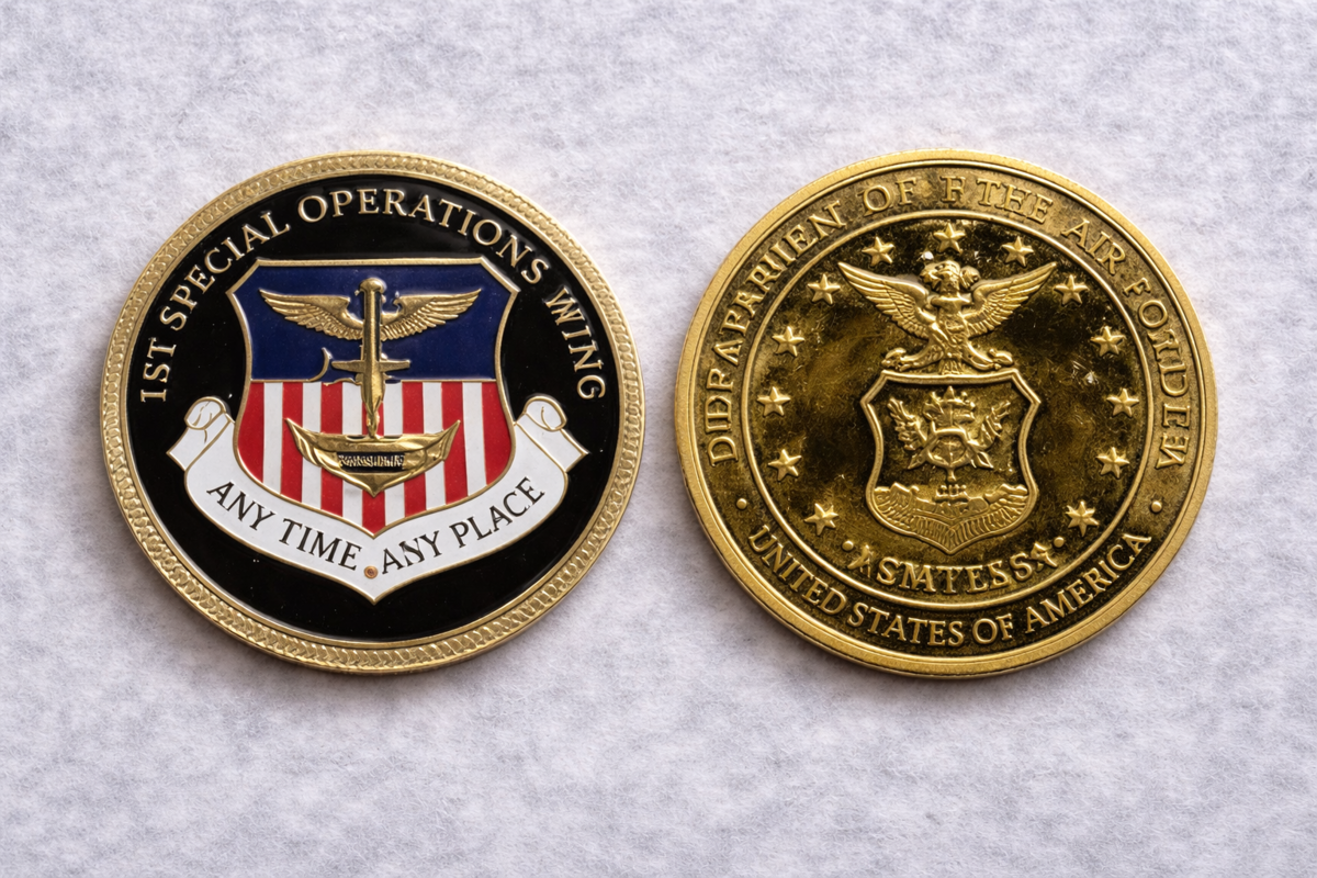 The product is a gold original challenge coin from the Air Force 1st Special Operations Wing with a special case retirement award. This collectible item, manufactured in the United States, features a militaria theme and has not been modified. It serves as a symbolic token of recognition and appreciation for the service of special operations personnel in the Air Force.